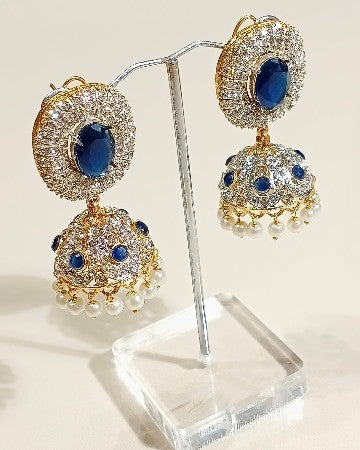 Elevate your ensemble with these exquisite blue party wear heavy earrings, designed to add a touch of sophistication and glamour to any occasion. Their rich blue hue and intricate detailing make them a statement accessory, perfect for enhancing your elegance while ensuring you stand out in style. Ideal for special events, these earrings combine bold design with refined craftsmanship.