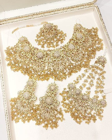 Elevate your elegance with this golden royal jewellery set, featuring a striking heavy jhumar that embodies timeless sophistication. Crafted to enhance any special occasion, this set combines rich golden hues with intricate detailing, offering a majestic touch that complements your regal style effortlessly. Perfect for making a lasting impression, it adds a refined sparkle to your ensemble.