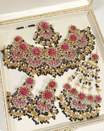 Elevate your elegance with this dark green and pink combo heavy jewelry set. Crafted to make a statement, it blends rich green hues with vibrant pink accents, perfect for adding a refined touch to your special occasions. The intricate design highlights tradition while ensuring you stand out with sophistication and grace.